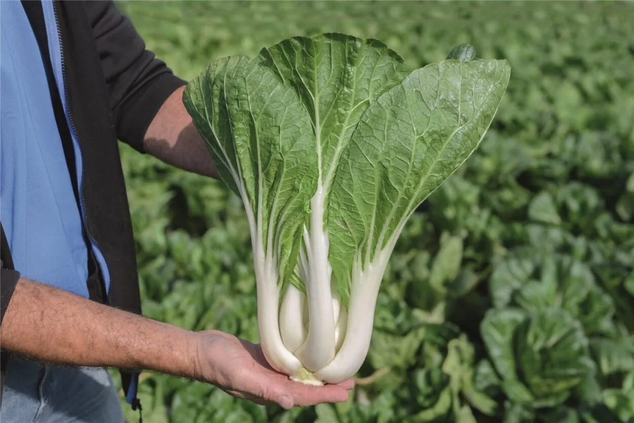 This large white-stem pak choi is very erect for easy packing into boxes. It is very attractive and uniform.